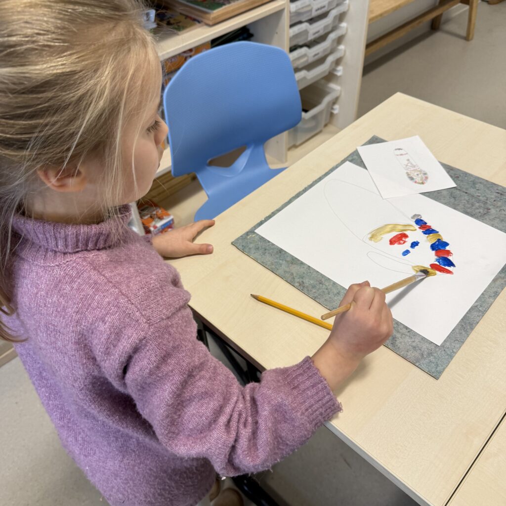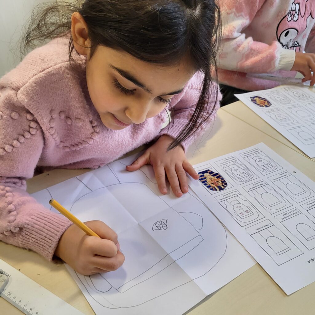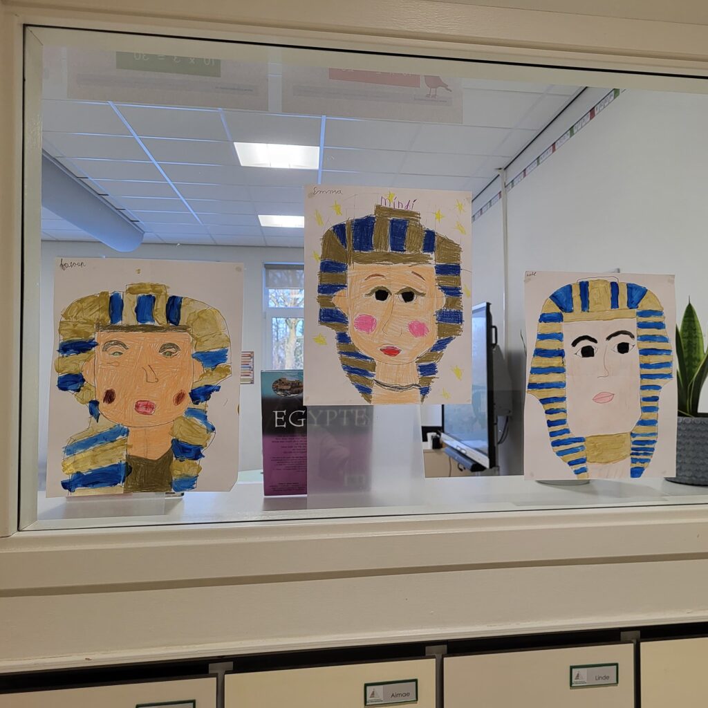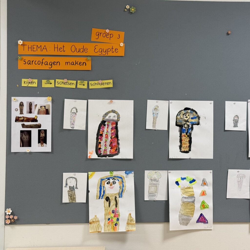 We gingen aan de slag met het ontwerpen van onze eigen sarcofaag. Na het bekijken van verschillende foto’s en voorbeelden maakten de kinderen eerst hun eigen schets, waarbij ze goed nadachten over vormen, kleuren en details. Toen was het tijd om ze te verven! Wat zijn ze mooi geworden.